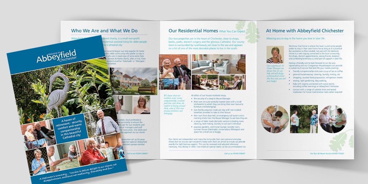 Abbeyfield Chichester is a non-profit, providing assistance to the eldery. Our brief was to create 2 visually distinct brochures, for their main residential living business, and their At Home services, carried through to print communications.